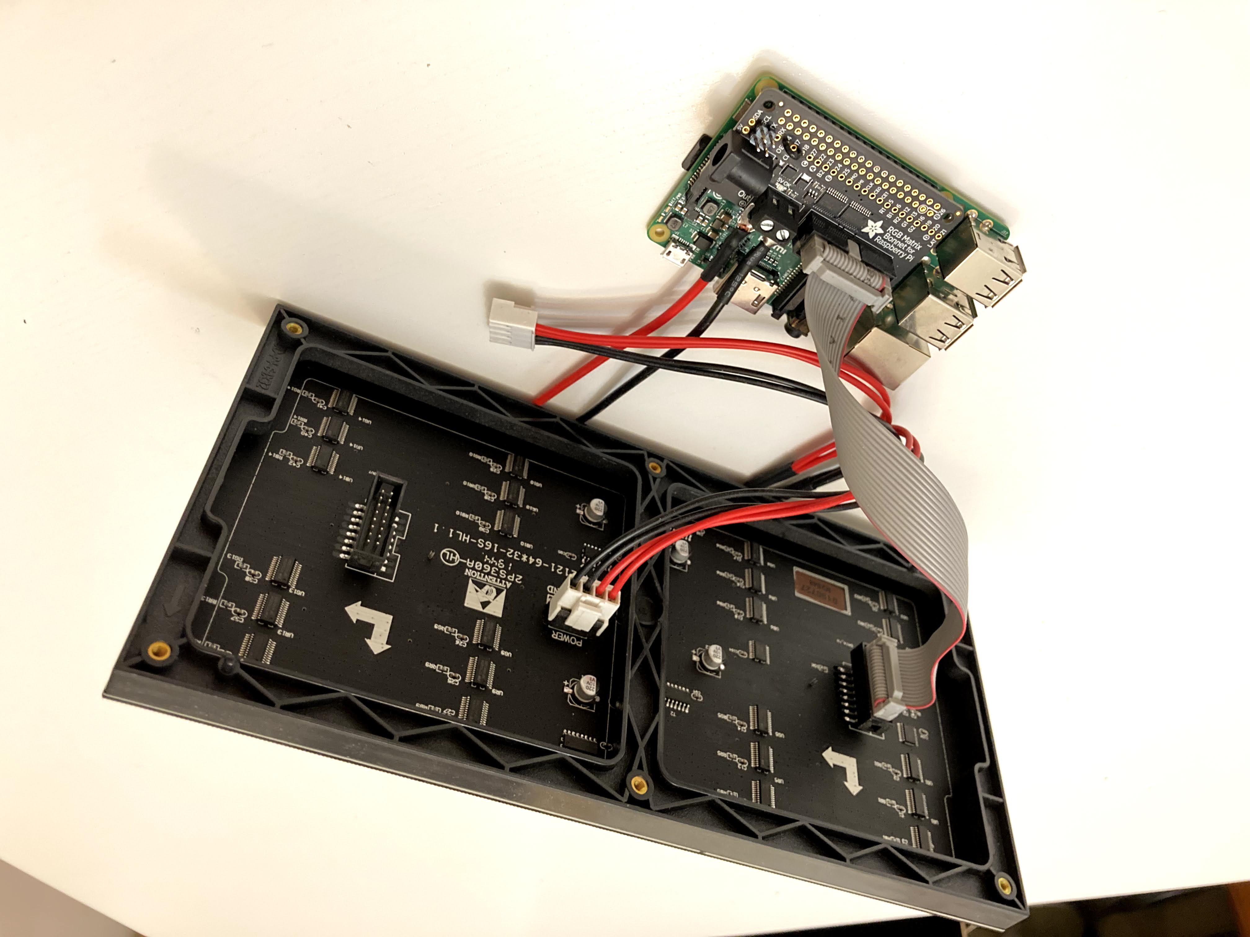 The hardware for this build is very simple. At the heart of the project is a Raspberry Pi 3B. The LED matrix is a 32x64 P4 hub75 matrix that I picked up on AliExpress for ~$20 CAD. Between the Raspberry Pi and the matrix is a Adafruit RGB Matrix Bonnet (this can be purchased from Digikey if you’re outside of the US). This bonnet makes driving the matrix with a Raspberry Pi nearly plug and play (i.e. absolutely invaluable to the project). Powering everything is a 5V 8A power supply, also from AliExpress. And that’s it!